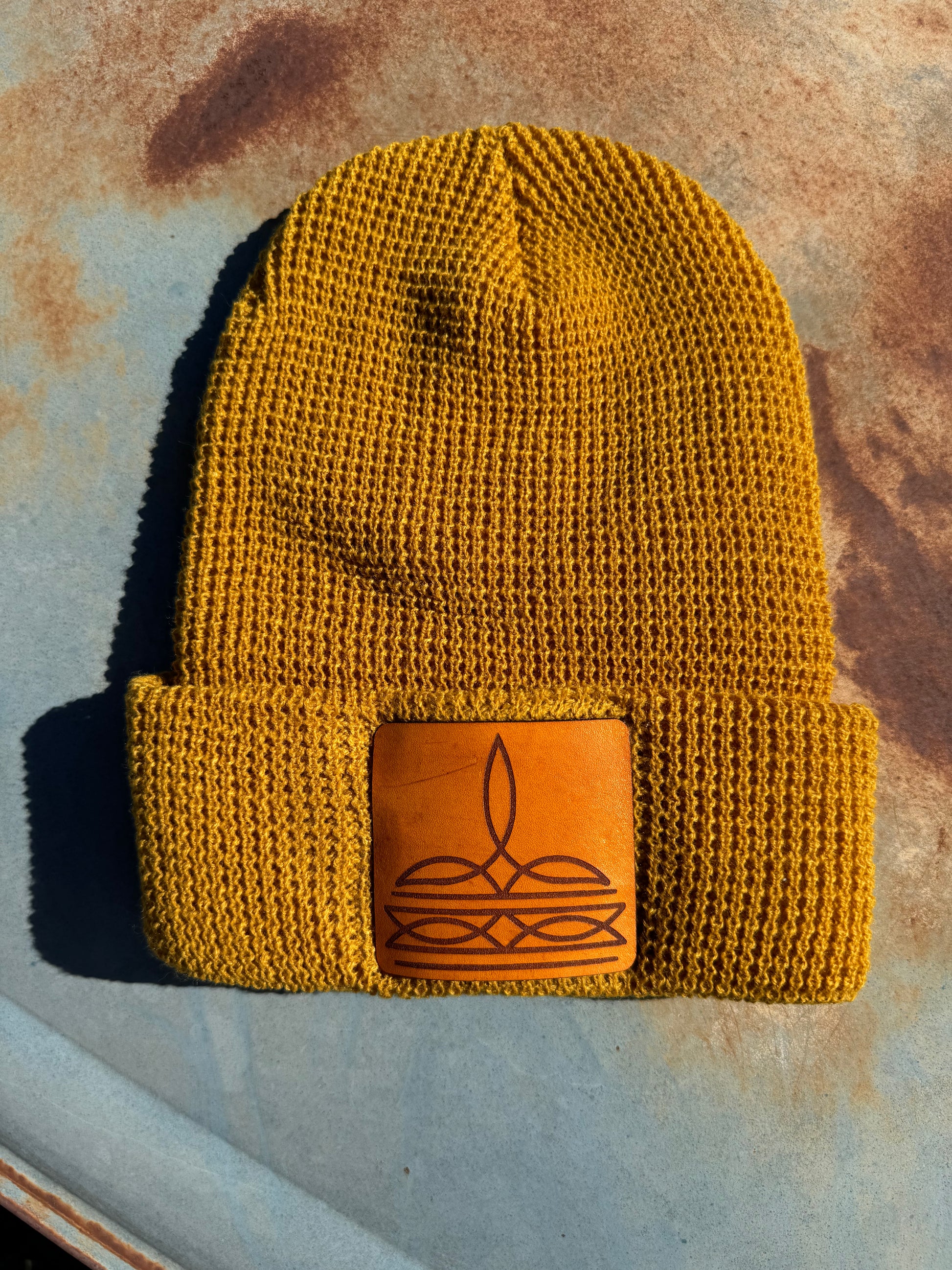 I present the Boot Stitch Beanie, featuring a genuine leather patch with a boot stitch design. The beanie offers both style and warmth, making it a versatile addition to your winter wardrobe. Add a touch of western to your outfit and keep cozy with the Boot Stitch Beanie.